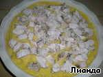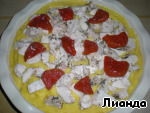 Куриное филе нарезать некрупными кусочками. Разложить сверху на овощи и слегка "утопить" мясо в овощном пюре.