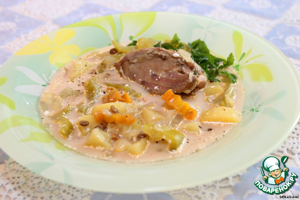 В приготовленный заранее бульон высыпаем нарезанный картофель и чечевицу. Варим.
