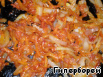 На разогретую с растительным маслом сковороду высыпаем специи, затем нашинкованный лук и натертую на крупной терке морковь, все это обжариваем. Еще, минут через пять, добавляем томатную пасту и продолжаем обжаривать до готовности.