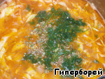 Минут через десять добавляем нашинкованную капусту и нарезанный кубиками болгарский перец. Солим, перчим по вкусу. -