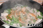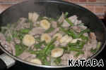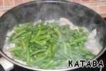 Обжариваем свинину с луком минут 5. Добавляем зеленую стручковую фасоль.