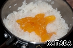 Тем временем, должен уже свариться наш рис. Мандарин режем на кусочки и давим, чтобы вышел весь сок.