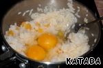 А теперь вбиваем в рис 2 яйца и хорошенько размешиваем на медленном огне, минуты 2-3, чтобы белок сварился.