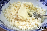 Делаем начинку. Брынзу выложить в тарелку и помять её вилкой. Добавить к ней сливочное масло и размять до однородной массы.