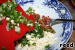 К массе из брынзы и масла добавить бекон и мелко порезанный лук. Можно вылить жир, который остался после жарки бекона. Еще раз все перемешать. Если брынза соленая, то солить не надо.