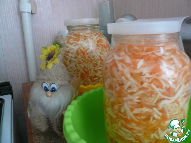 У нас в семье капусту делает супруг. Долго он хранил свой рецепт в тайне. Несколько лет. Но сегодня, после долгих уговоров, тайну открыл. Особенность его в том, что не нужно перетирать с солью, мять, искать гнeт. Ещe мне нравится, что она не сильно кислая. Это не всем может и понравится. Вот, например, моему отцу покислее подавай, а мне больше такая нравится.