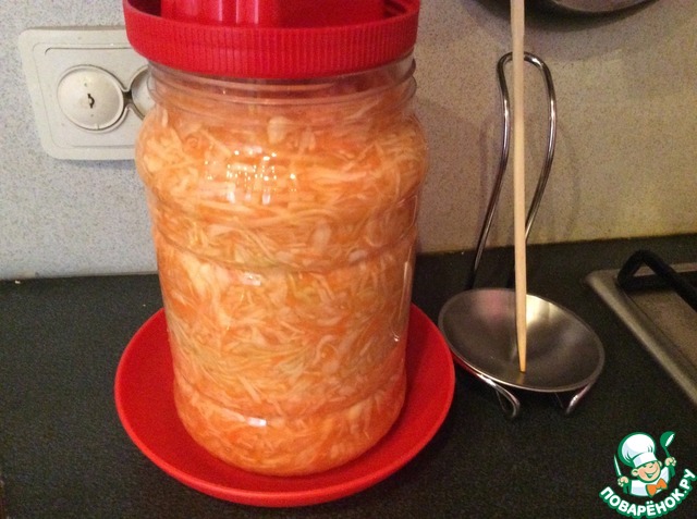 Залить рассол в банки. Накрыть банки чистой марлей (чтобы мусор не попал) и поставить в ёмкость, например, таз (по мере закисания сок из банки может "убегать" ). Оставить банки на трое суток. В первые 12 часов брожения придётся ложкой вычерпывать лишний рассол в кружку, иначе он просто вытечет. В течение всего времени два раза в сутки необходимо проткнуть капусту острой палочкой до дна 5-6 раз, чтобы выпустить газ, образующийся при брожении (иначе, капуста будет горькой).