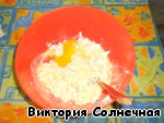 Добавляем творог, яйцо и муку. Все тщательно перемешиваем.