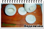 Отварные яйца (у меня было 6 шт.) почистить и срезать немного снизу, для стойкости яиц (не по середине, как мы обычно это делаем).