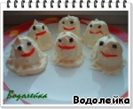 Дальше "оживляем" наших "привидений". Глаза делаем из кусочков черных маслин или черного перца горошком. Рот - из кусочка сладкого перца или помидора. -