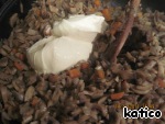 К грибам добавить густые сливки или сметану (у меня сливки), перемешать, еще потушить (до загустения), добавить соль и специи по вкусу.