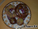 Рецепт глазури подойдет любой, но я делаю так: в посуду высыпать сахарную пудру, добавить горячую воду и перемешать, пока масса не станет гладкой и настолько густой, что станет налипать на ложку густым комком. Для вкуса и цвета можно добавить какао или заменить воду на какой-нибудь сок, или, если не хотите изменять цвет, а только вкус, добавьте лимонный сок и, что немаловажно - никакой варки! Покрывать изделия нужно немедленно... застывает очень быстро.