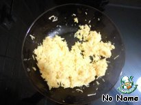 Сыр натираем на мелкой терке, выдавливаем чеснок, добавляем желток и хорошо все перемешиваем