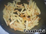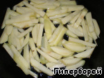 Очищенный, нарезанный, промытый и просушенный картофель выкладываем в сковороду и перемешиваем.