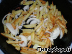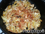 Добавляем нарезанный полукольцами лук. Перемешиваем и продолжаем жарить.