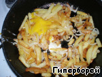 Как только лук станет полупрозрачным, добавляем яйцо, перемешиваем, и продолжаем жарить.