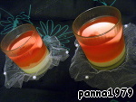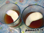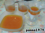 Тем временем займемся приготовлением второго слоя. Здесь все очень просто. Доводим до кипения фруктовый сироп (у меня был абрикосовый). Растворяем в нем желатин, процеживаем и даем ему остыть, так как если мы будем разливать его по формам теплым, то есть вероятность, что нижний слой "поплывет". Достаем из холодильника формочки с застывшим нижним слоем и аккуратно покрываем его вторым фруктовым слоем. И опять ставим в холодильник.