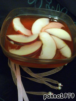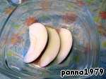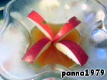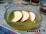 Яблоко нарезаем тонкими дольками и выкладываем ими узоры в формах с желе. Сложными узорами лучше не увлекаться, так как по мере заливки желе яблоко всплывет, и узор может нарушиться.