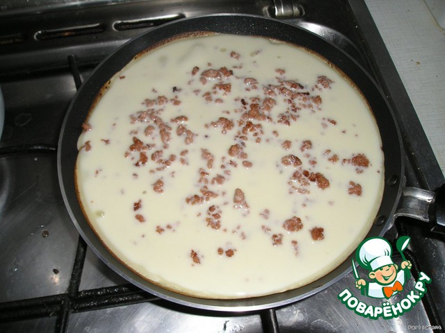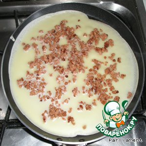 Наливаем на сковороду тесто и насыпаем припек (мясо, яйцо)...