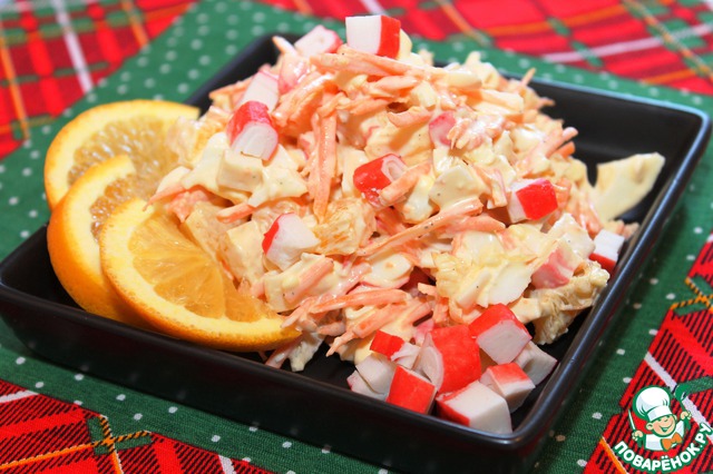 Для начала отварим и почистим яйца и морковь. Этот этап можно сделать заранее. Апельсин очистить от кожуры и пленок (это самый длительный и скучный момент готовки). Все ингредиенты нарезать мелкими кубиками. Более изысканным вариантом нарезки может выступать такой: морковь - ломтиками, яйца д- ольками, крабовые палочки - соломкой. Ну а апельсин в обоих случаях - каждую очищенную дольку разделить на несколько частей вдоль волокон.