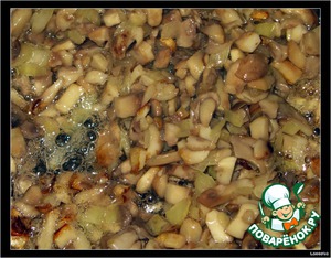 Грибы, лук нарезать и обжарить на растительном масле до золотистого цвета. Посолить, добавить специи.