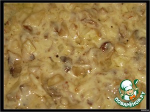 Влить сметану, убавить огонь, тушить 10 минут, за 2 минуты до конца тушения посыпать 1/2 частью муки и тщательно перемешать.