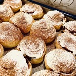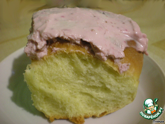 Вынуть булочки из духовки, дать постоять минут 5, затем извлечь из формы и переложить на решетку. Щедро смазать кремом, пока булочки горячие.