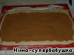 Смазать растопленным сливочным маслом. Сверху распределить начинку, оставив свободными около 1,5-2 см, у дальнего широкого края прямоугольника. Надо сказать, что по рецепту требовалось 150г сахара и 3 ст. л. корицы, но начинки получилось слишком много и при сворачивании рулета и, особенно, при нарезании она активно высыпалась. Высыпалось где-то 1/3. Поэтому я количество продуктов для начинки уменьшила.