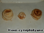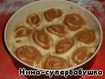 Нарезать рулет на 12 равных частей. Выложить их в смазанную сливочным маслом форму (подойдет и круглая, и квадратная) или на противень на некотором расстоянии друг от друга, если хотите испечь просто булочки и поставить в теплое место для расстойки.