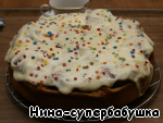 Готовый пирог мы решили украсить. Поручили это важное дело внучке. Она подошла к делу очень серьезно, сама выбрала посыпку и потом очень сосредоточенно раскладывала ее по пирогу)))
