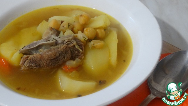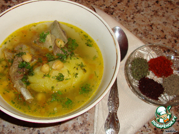 В конце добавить пассерованный лук, нохут, шафран или половину чайной ложки жёлтого имбиря в бозбаш.