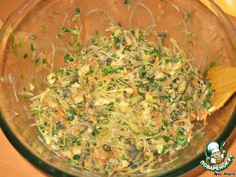 К свинине добавить грибы, зелень, рисовую лапшу, морковь, два желтка (сваренных вкрутую, раскрошить руками), черный молотый перец, молотый имбирь, пару столовых ложек рыбного соуса. Хорошо перемешать и оставить настаиваться 15 минут.