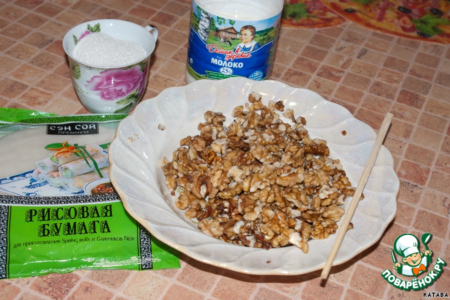 Не знаю, как у вас обстоят дела с рисовой бумагой, но у нас продается вот такая фирмы "Сен Сой". В отделе для суши обычно. Орехи я взяла грецкие, считаю, что с ними вкуснее. Еще нам понадобится тонкая круглая палочка - идеально подходит для этого китайские палочки для еды. А зачем - увидите дальше.