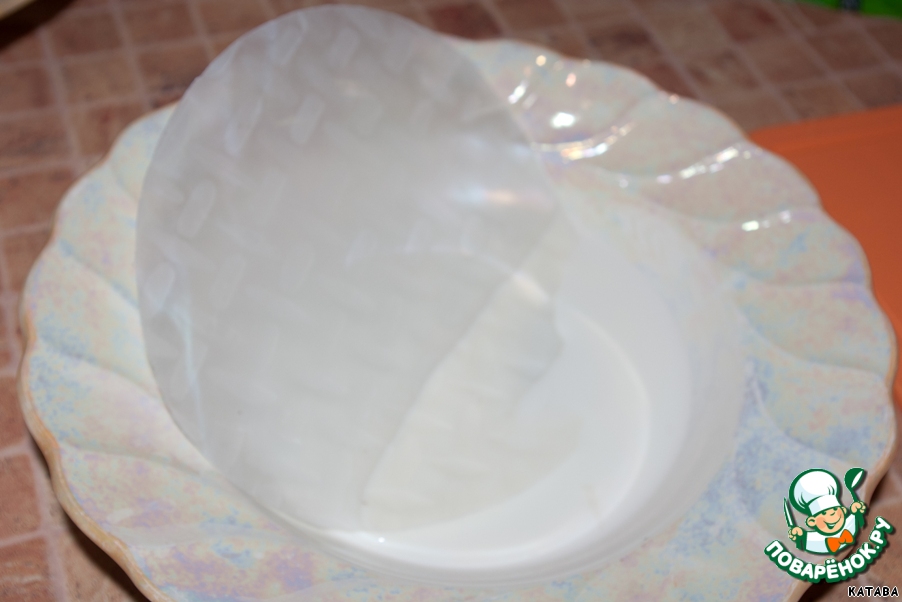 0,5 стакана молока выливаем в глубокую тарелку, добавляем туда щепотку соли и ложку меда (по вкусу и желанию). Размешиваем, чтобы мед растворился. Теперь берем наш листик рисовой бумаги и хорошенько вымачиваем в молоке, аккуратно расправляя и размягчая руками. Листы вымачивать по одному, чтобы не слиплись.