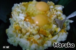 В чашку с рисом добавить нарезанные вареные яйца, посолить, поперчить, добавить куркумы, перемешать. Затем добавить свежие яйца и все перемешать.