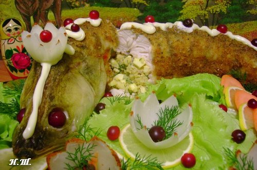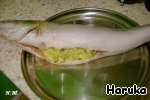 Примечание: при выпекании начиненной рыбы в форме начинка остается сочной и рассыпчатой. При выпекании на противне начинка менее сочная, напоминает суфле, так как во время приготовления вытекает сок.