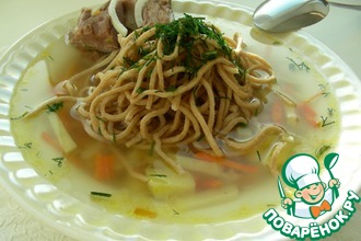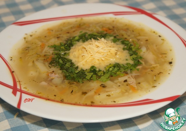 За 10 минут до окончания готовки добавляем вермишель и приправляем травами. Подаем суп, украсив петрушкой и посыпав тертым сыром.