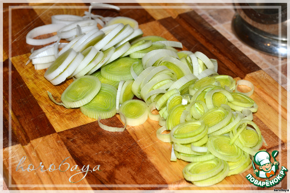 Я давно и крепко влюблена в лук-порей. В холодильнике всегда есть свежая порция, и я регулярно ищу что-то новенькое, куда бы его пристроить ) Захотелось супчика, и на форуме say7 (Джанго) нашла этот замечательный рецепт. Получилось очень вкусно, но пару корректив я своих внесла.