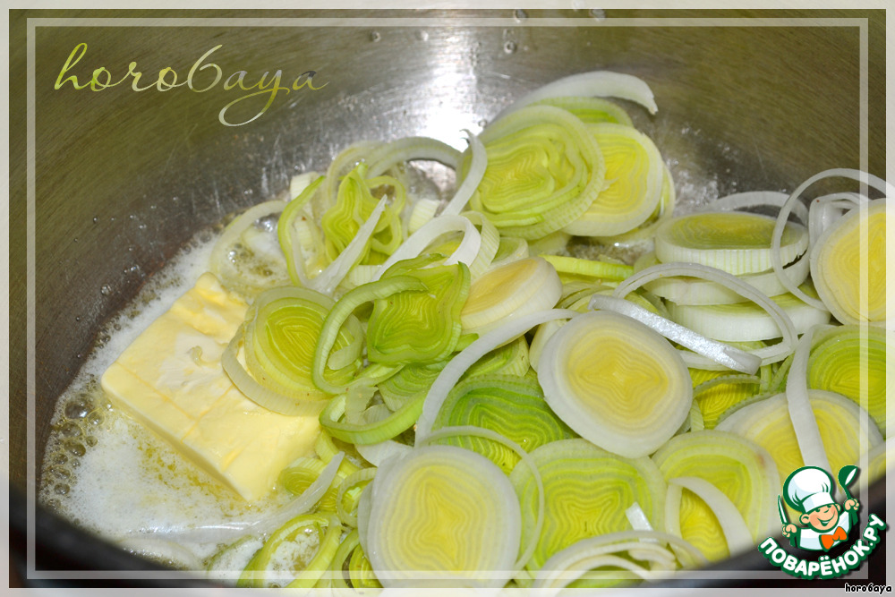 В кастрюле распускаем масло, выкладываем лук-порей и обжариваем до мягкости лука - около пяти минут.