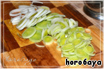 Лук-порей тщательно моем (распушиваем листья под струей воды), просушиваем и нарезаем кольцами.