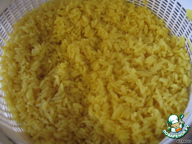 Отвариваем рис в подсоленной воде с щепоткой шафрана до полуготовности
