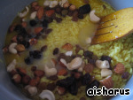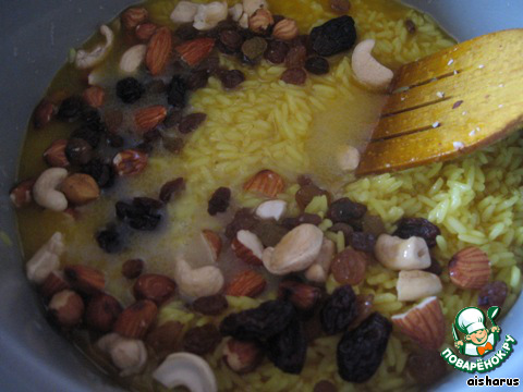 Добавляем рис и орехи с сухофруктами, перемешиваем, накрываем плотно крышкой и готовим на медленном огне до готовности.