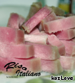 2. Берем тунец. Размораживаем и нарезаем его. Кстати, в Италии мясо не очень популярно. Его отлично заменяют морепродукты. Например, в венецианской кухне популярны блюда "anguiila" - из угря и "zuppa di pesce" - рыбный суп. Также итальянцы любят рыбу на гриле, креветки на рашпере, и блюда из риса с рыбой. Гурманы оценят "granseola" — мясо морского паука, приготовленное в панцире самого животного, головоногие моллюски с полентой (кашей из кукурузной муки), отвар из рисовой муки в сочетании с "sarde in saor" - сардинами в масле и уксусе. Что касается тунца, то его жарят на гриле, делают карпаччо с лимонным маринадом, добавляют в салаты. На основе консервированного тунца готовят соусы к мясу и курице.