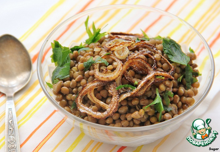 Выложить готовую чечевицу на большое блюдо, посыпать сверху хрустящим луком и зеленью. Блюдо можно использовать как самостоятельное или в качестве гарнира.
