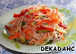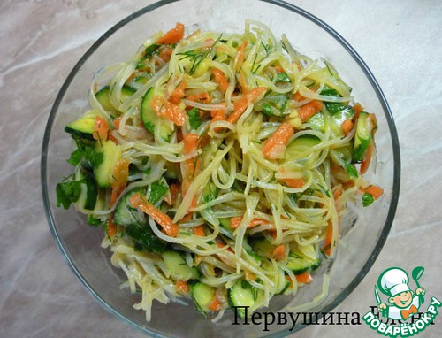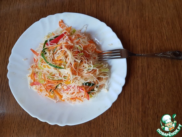 Знаю, что любителей фунчезы на сайте немного! Да и рецептов данного салата более, чем достаточно. Но многие из них включают в себя термическую обработку овощей (пассеруем, обжариваем и т. д. ), что значительно увеличивает время их приготовления. Это «теплые» салаты моего детства, когда мы вместе с мамой готовили на праздники морковь с кальмарами по-корейски и заливали всe горячим пассерованным луком. До сих пор я обожаю этот салат! Но речь сейчас не об этом, видя готовые корейские салаты на рынках или в супермаркетах, мы сталкиваемся с простотой их изготовления и с отсутствием этой самой термической обработки. Вот именно такой салат я предлагаю вам приготовить за 15 мин. Приглашаю в гости всех любителей фунчезы и не только.