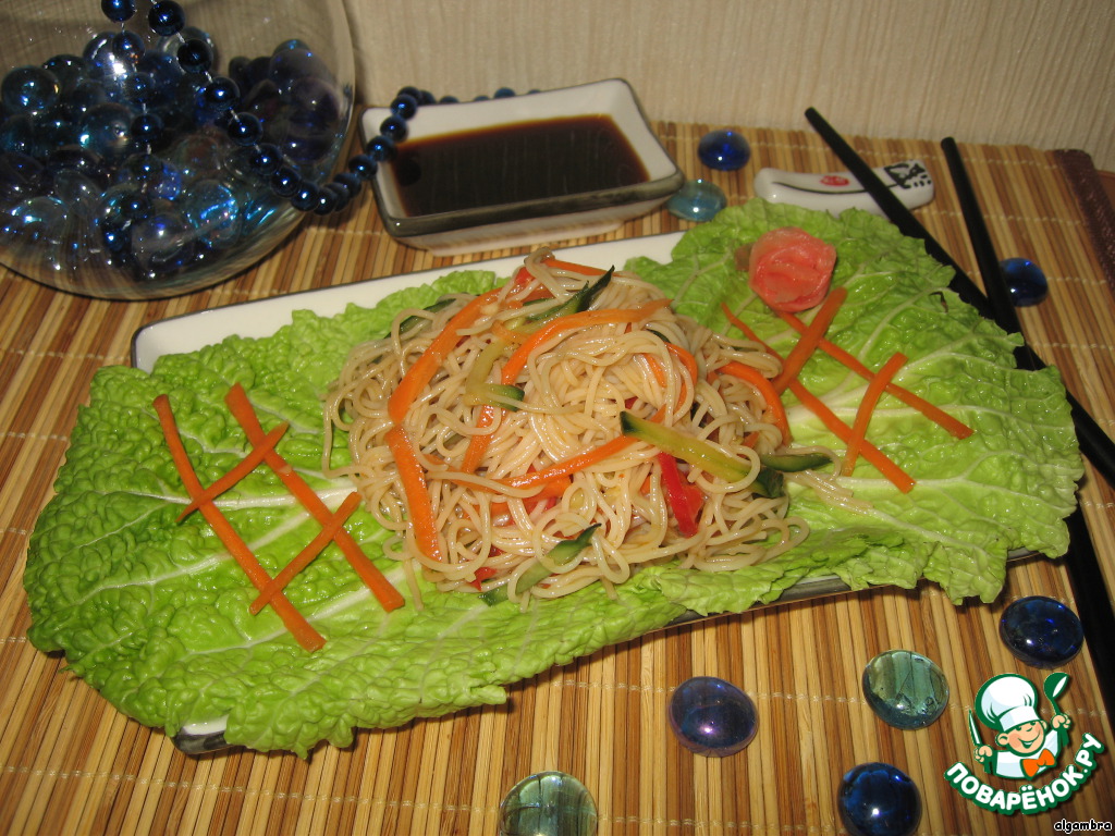 Рада, что вам понравился салат. Соевый соус можно добавлять в любых количествах - на ваш вкус. А рисовую лапшу я всегда помешиваю во время приготовления - это "действие" не дает ей слипнуться! Готовьте на здоровье!