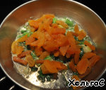 К зелёному луку добавим нарезанный абрикос и покрошенный миндаль, чуть (2 минуты) обжарим