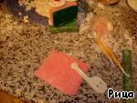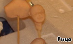 Вернее, для малышки-пупсика мне понадобилась только головка, я её соединила с кусочком продолговатым мастики и "запеленала" в одеялко. На головку куколки повязала платочек, просто раскатав кусочек белой мастики.