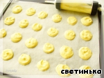 Ах, да, духовка должна быть полностью готова принять дорогих гостей, разогрета до 190 градусов! Пока она раскочегарится, мы отсадим наши пироженки с помощью кондитерского шприца. Опять же, вспоминаем, что они у нас на один укус, а не так, шоБ, пАнимаШь, рот радовался, т. е. в диаметре примерно 2 см.