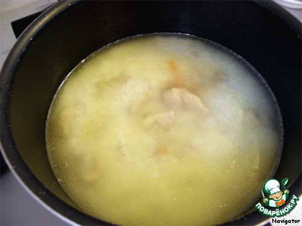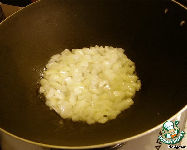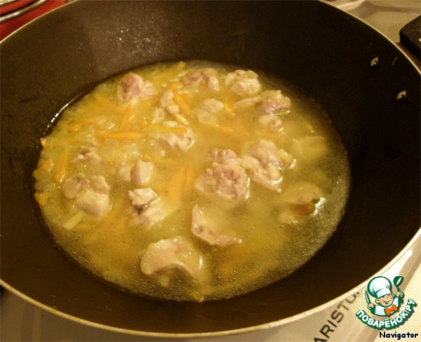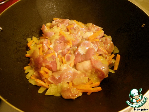 Выложить порезанное на кусочки мясо и слегка все обжарить, чтобы курица схватилась.